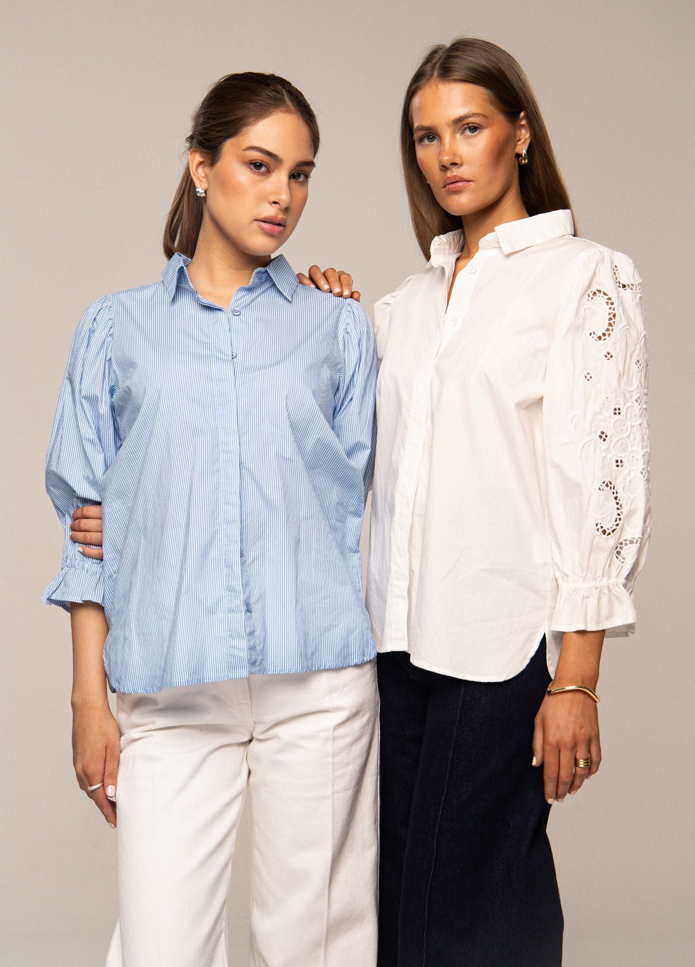 The Amy Shirt boasts comfortable cotton poplin quality and beautiful feminine details. Ruffles and elastic along the cuffs, along with stylish puff sleeves with beautiful embroidery. It makes it a superb choice for tucking into a skirt or jeans. A comfortable, true-to-size fit. Choose your usual size.