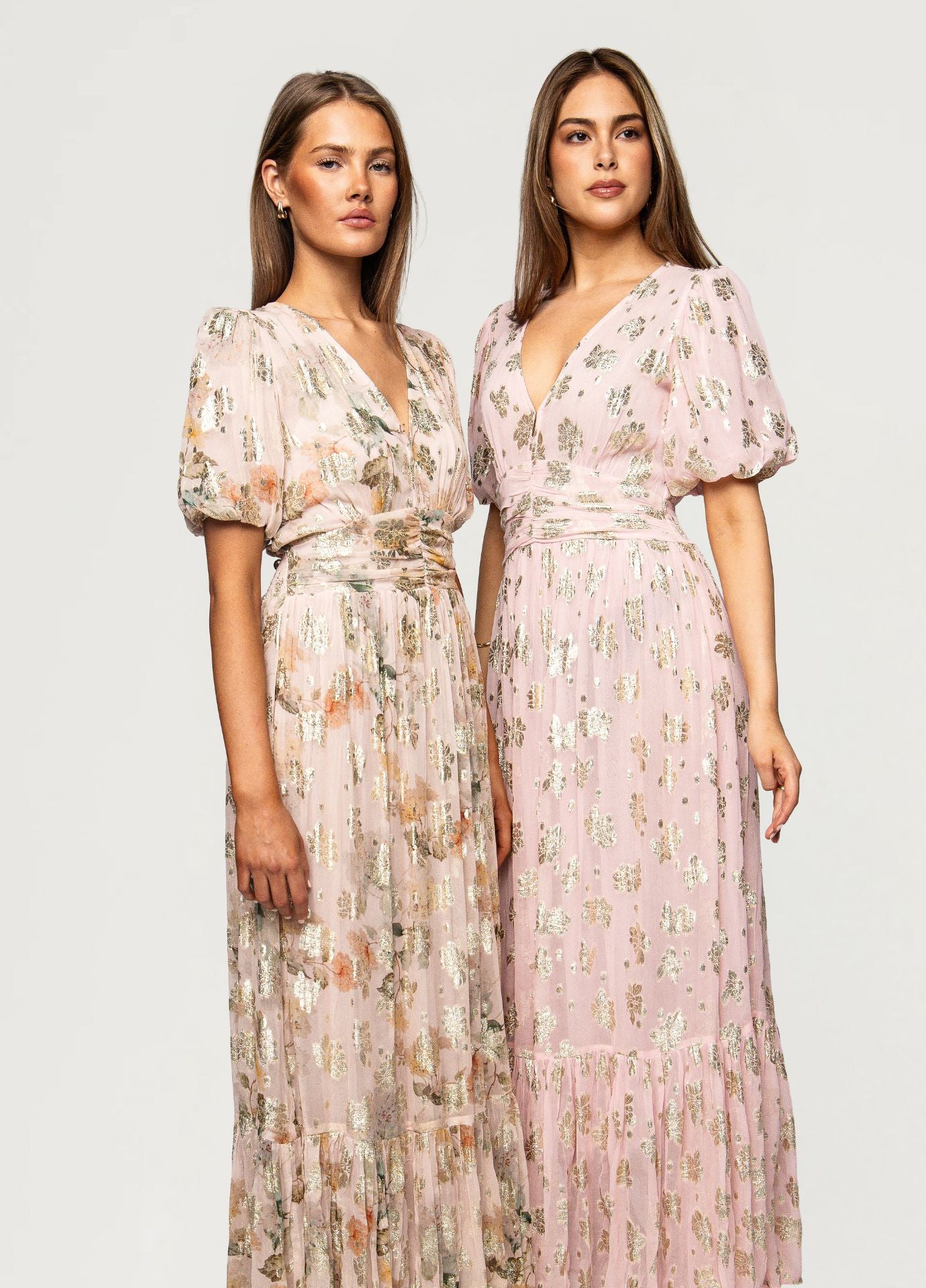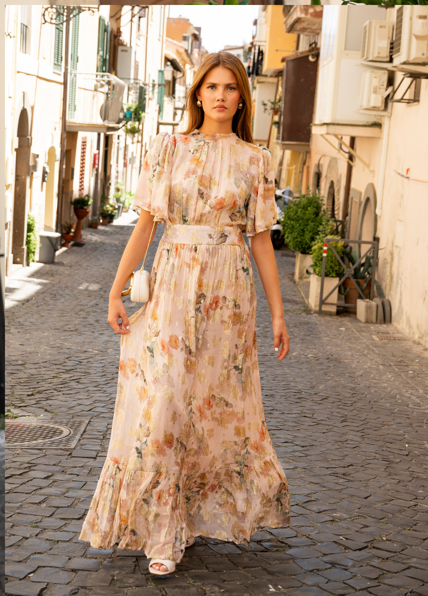 A new wedding favourite - Heena Shimmering Garden in delicate viscose georgette with gold lurex detailing. This dress is maxi length, and has a fitted waistline made of smocking in the back for the perfect silhouette. It has loose elbow-length sleeves and the neckline ties into a pretty bow in the back. A slight opening in the back gives this dress an extra feminine touch, and it also has flounce at the hemline for nice flow in the skirt. A comfortable, true-to-size fit. Choose your usual size.