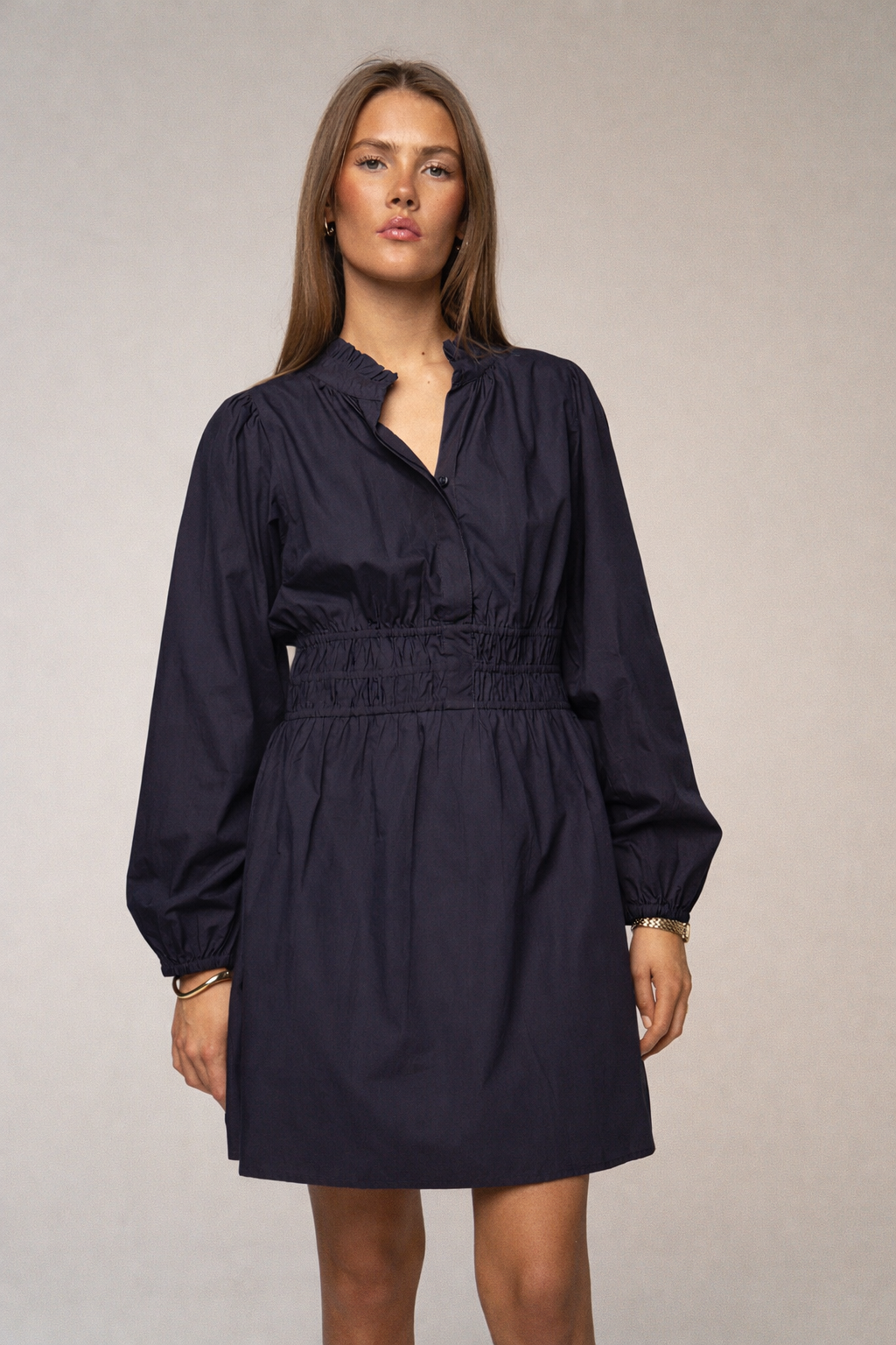 The Latika Dress is made of 100% cotton poplin quality. It has a mini length, buttons up in the front, and has a fitted waistline made of smocking. A simple a-shaped skirt, and long voluminous sleeves with elastic in bottom. Pockets in side.