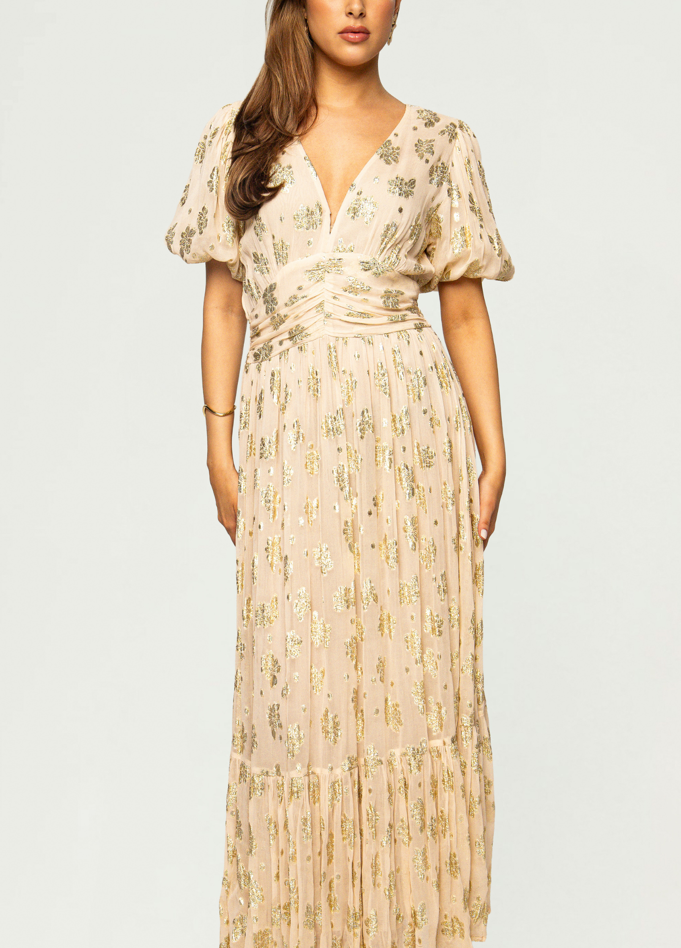 The Leonora Dress is designed to make you feel confident and comfortable. Its V-neckline flatters your silhouette, while the short puffed sleeves with elastic cuffs offer a gentle, supportive fit. The gathered waist and back smocking provide subtle shaping, and the maxi length gives you freedom of movement. A back zipper makes getting dressed effortless. Choose your usual size.