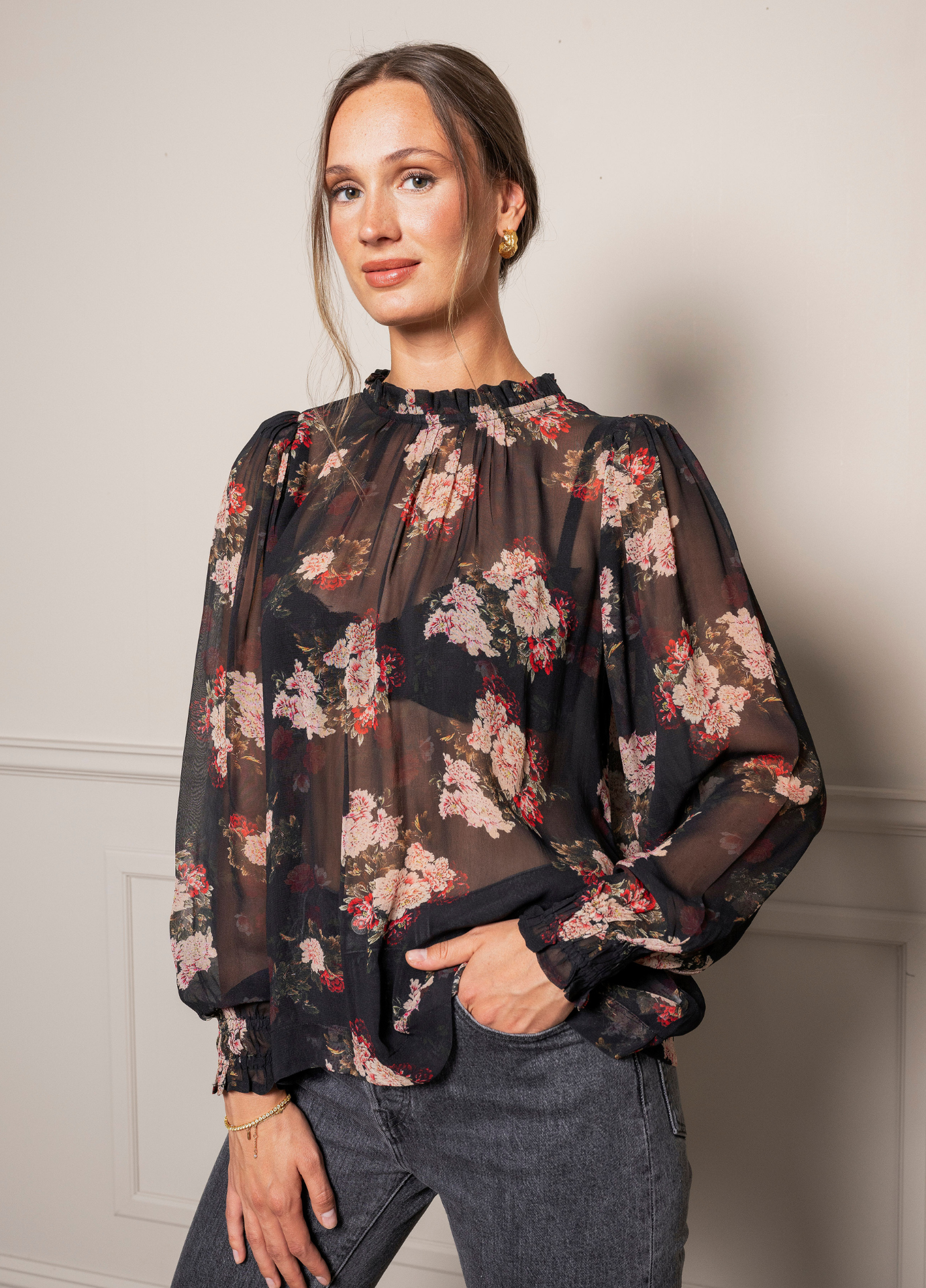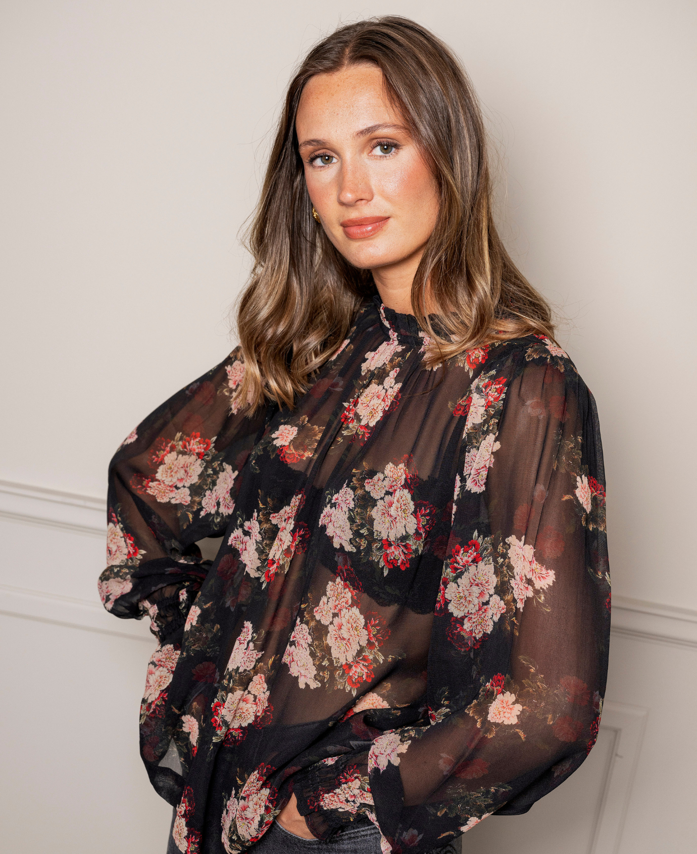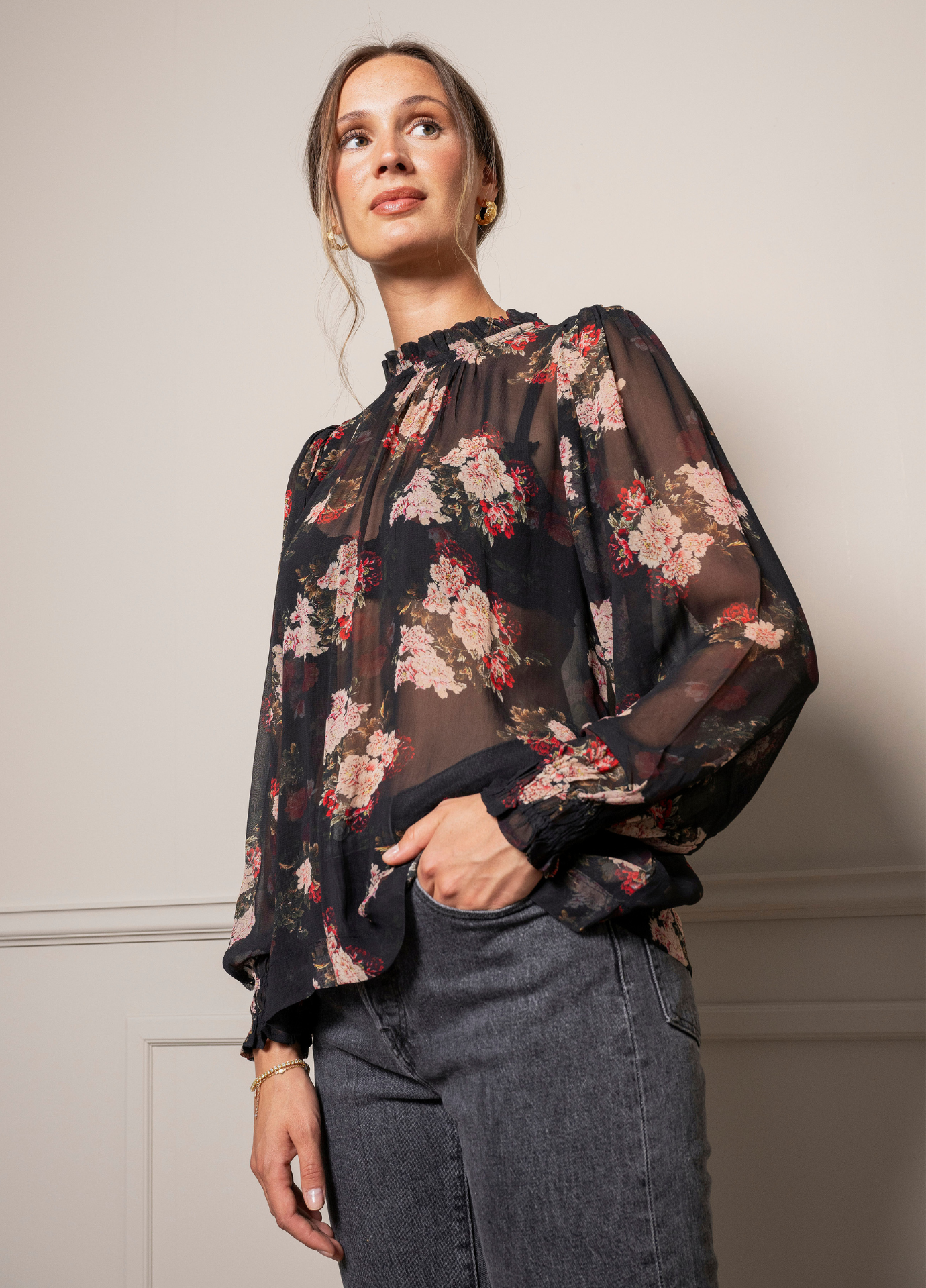 The Amrita Blouse is cut in our delicate viscose georgette quality. The blouse has a high neck with buttons in the back, long voluminous sleeves with tight cuffs and rouching details.