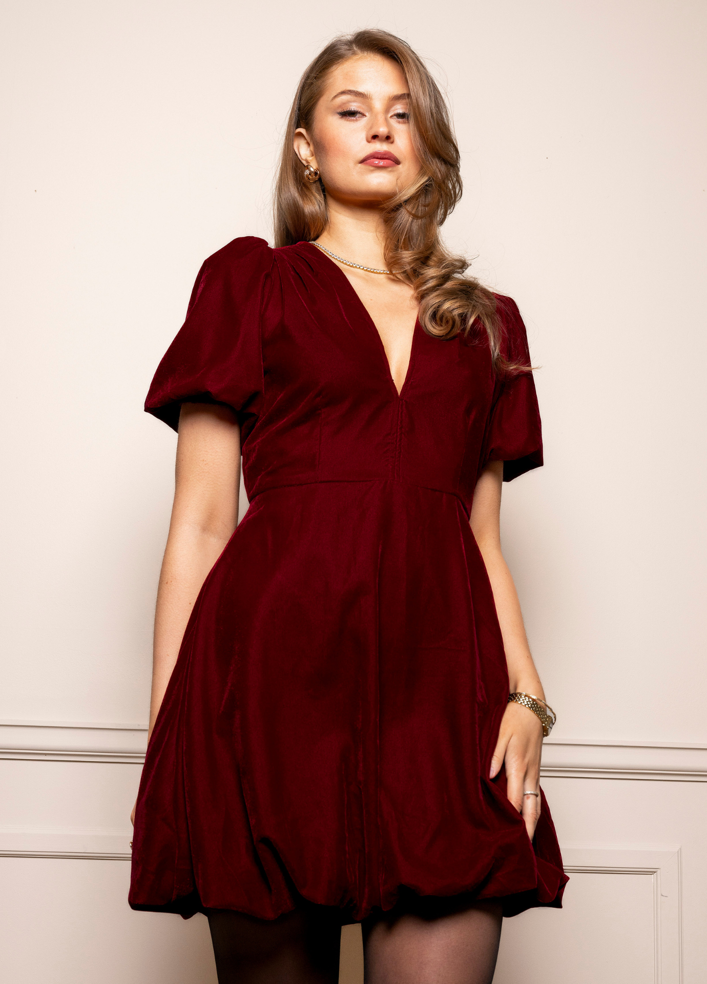 The Blake Dress comes in a soft velvet quality. It has a mini length, short voluminous sleeves, balloon skirt and a fit that hugs the body gracefully. It closes with a sipper in the back, and ties at the top as well. A comfortable, true-to-size fit - choose your usual size. (PRE-ORDER. DEL: WEEK 41)
