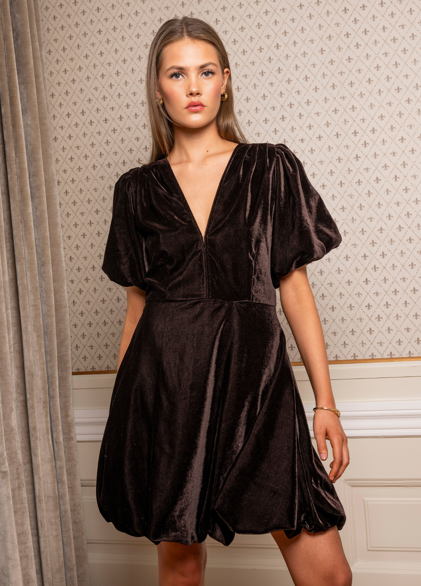 The Blake Dress comes in a soft velvet quality. It has a mini length, short voluminous sleeves, balloon skirt and a fit that hugs the body gracefully. It closes with a sipper in the back, and ties at the top as well. A comfortable, true-to-size fit - choose your usual size. (PRE-ORDER. DEL: WEEK 41)