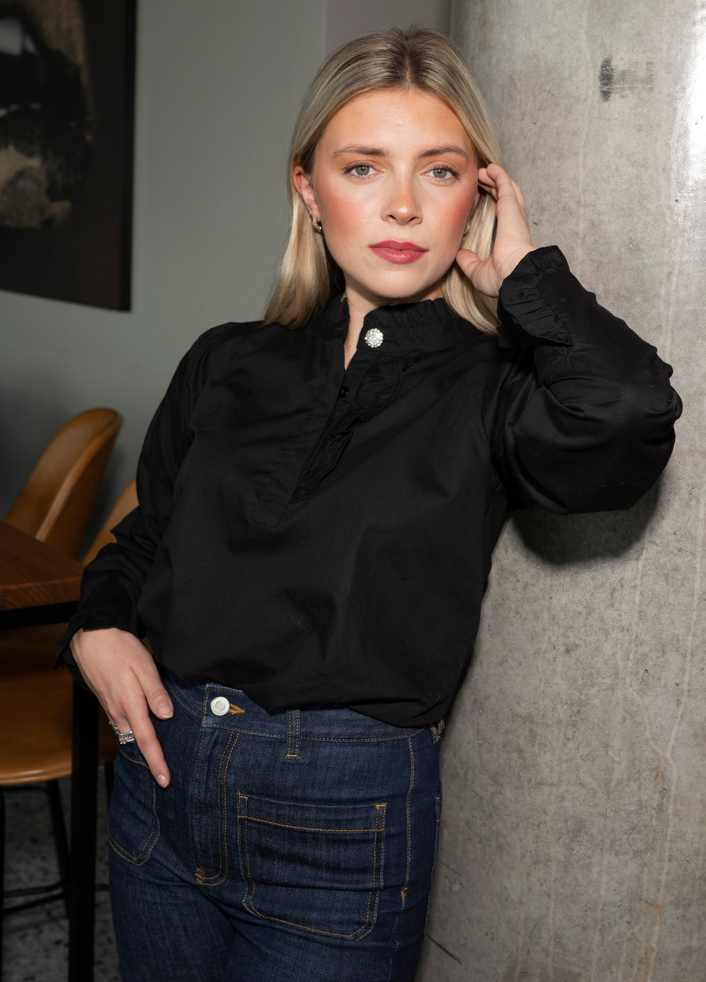 The Ella Blouse is made in our cotton poplin quality. It has a straight fit, buttons down in the front, and long sleeves. Ruffles on the sleeves and around the neck. Combine the blouse with trousers or jeans for the perfect everyday look! A comfortable, true-to-size fit. Choose your usual size.