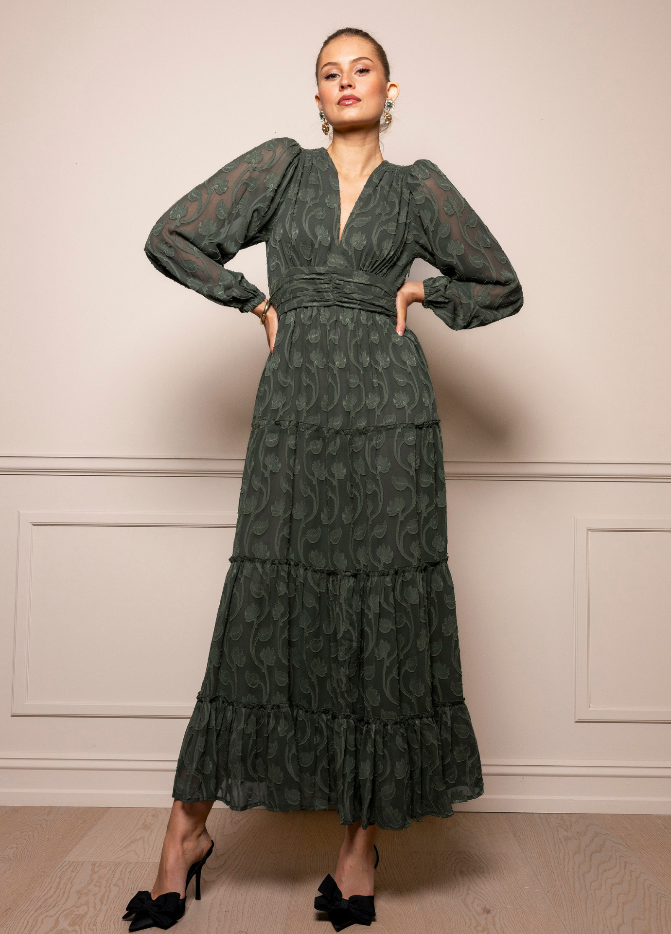 The Noor Maxi Dress is cut in our 100% polyester georgette quality. It has a maxi length, a fitted waistline made of pleated details and smocking in the back, and long, puffed sleeves with elastic cuffs. The dress has a V-neck and closes in the side with a zipper. A comfortable, true-to-size fit. Choose your usual size.