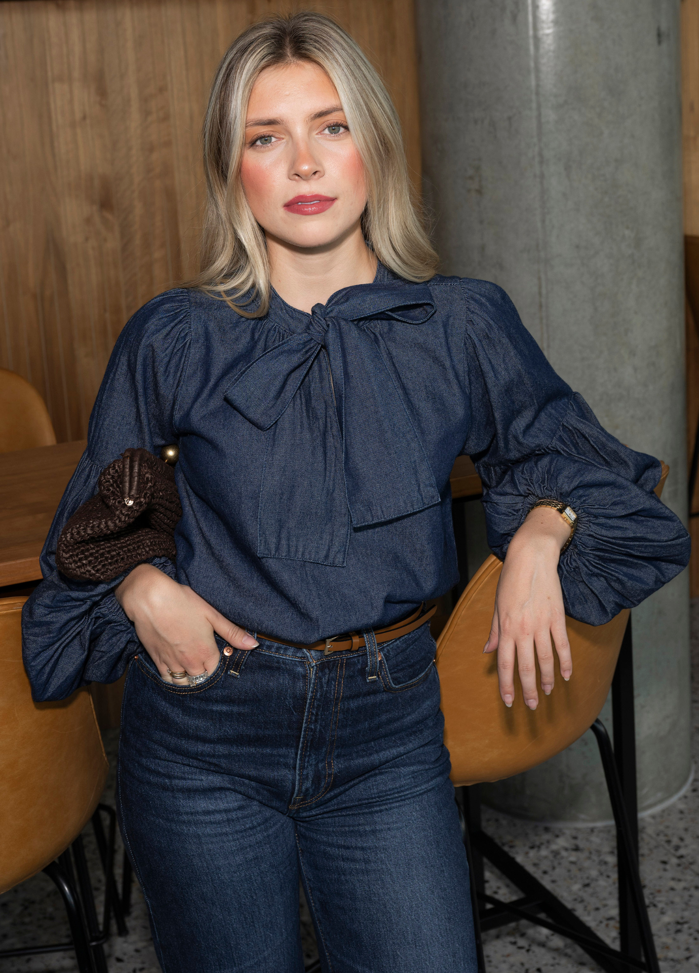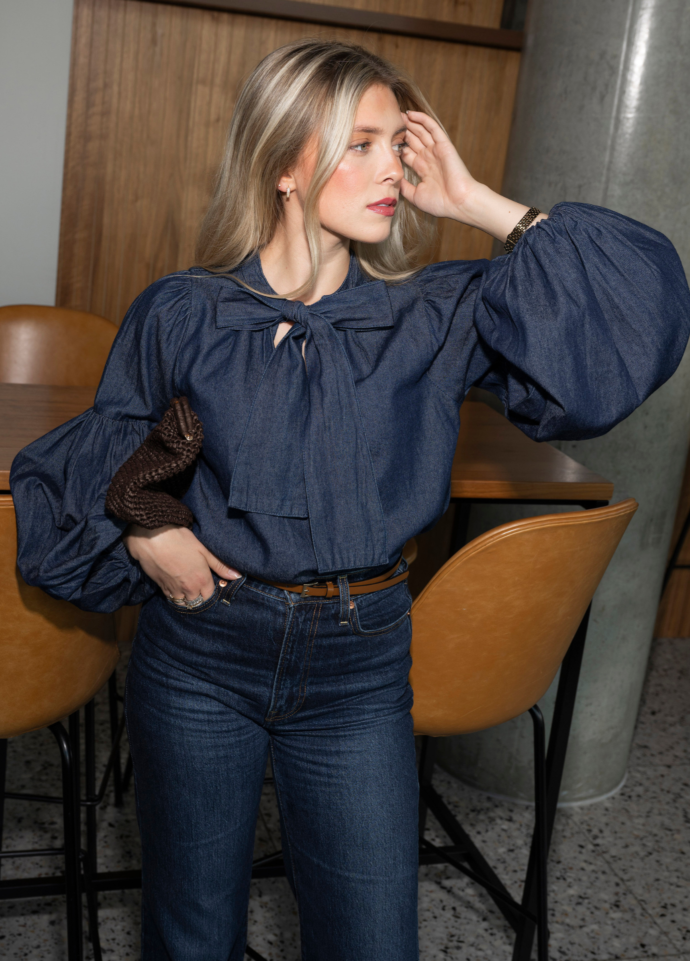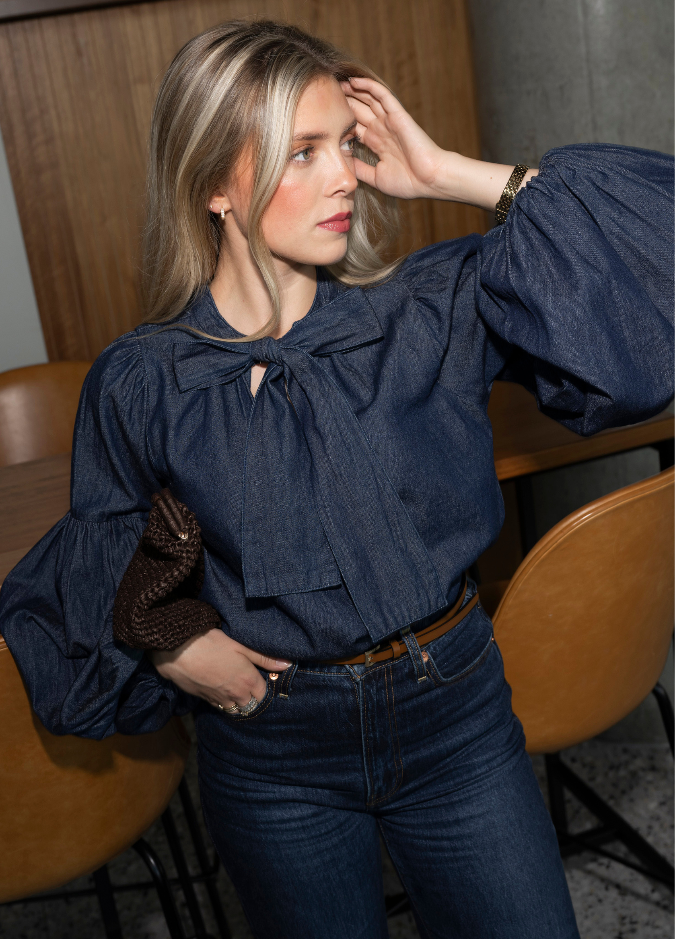 The Ria Blouse is cut in our 100% cotton quality. The blouse has a relaxed fit, long sleeves with elastic cuffs and a big bow in the front. Combine with leather pants for a nice look!